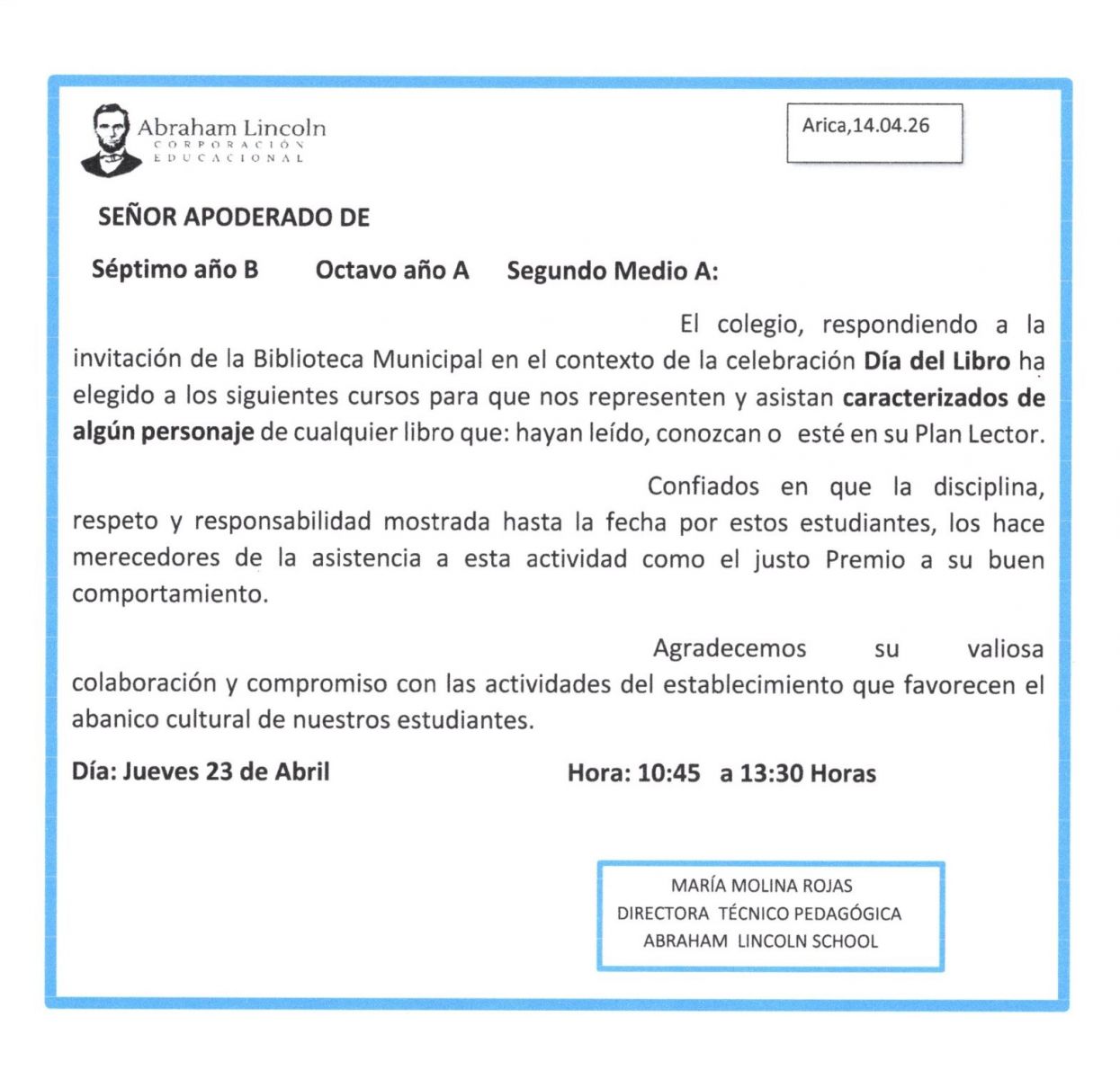 Se informa a la comunidad escolar que dando cumplimiento a lo instruido por el Ministerio de Educación, se debe realizar una jornada con todos los estudiantes con la finalidad de realizar una revisión de nuestro RICE con sus respectivos protocolos. Esta actividad se llevará a cabo mañana 16 de abril en las dos primeras horas de clases.